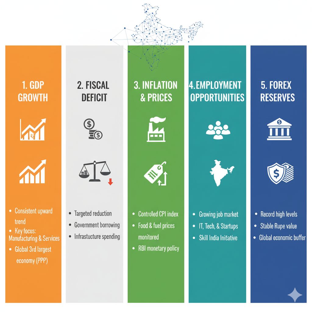 भारत की वित्तीय स्थिति 2025 में स्थिर और सकारात्मक है। GDP लगातार बढ़ रही है, विदेशी मुद्रा भंडार मजबूत है और सरकार नई नीतियों से अर्थव्यवस्था को आगे बढ़ाने का प्रयास कर रही है। हालांकि, रोजगार और महंगाई जैसे मुद्दों पर और काम करने की आवश्यकता है।